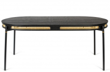 | Material: | 20 mm tapa de mesa. Marco de contrachapado chapado. Bisel de ratán. Patas de hierro pintadas en polvo con acabado dorado. |