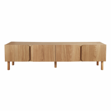 El banco está fabricado en MDF con chapa de roble blanco americano de alta calidad y se apoya firmemente en patas de madera maciza. Las esquinas redondeadas y los paneles de las puertas estriados, que juntos forman un discreto patrón inspirado en hojas de palma, aportan una estructura viva y un diseño con ese toque especial.